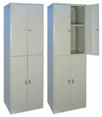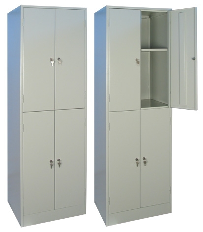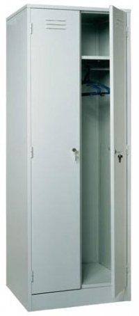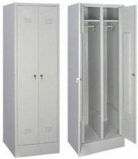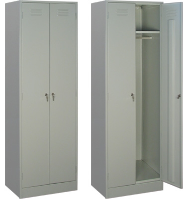 Шкаф металлический разборной двухсекционный, предназначен для хранения сменной одежды. В каждом отделении находятся полка для головных уборов и перекладина для вешалки. Отделение шкафа оснащено индивидуальным врезным замком. Покрытие - полимерное порошковое серого цвета.