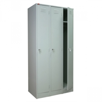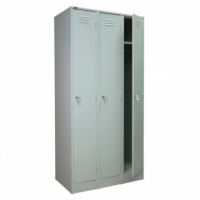 Шкаф металлический разборной трехсекционный, предназначен для хранения сменной одежды. В отделении находятся полка для головных уборов, крючки для одежды и перекладина для вешалки. Отделение шкафа оснащено индивидуальным врезным замком. Покрытие - полимерное порошковое серого цвета.