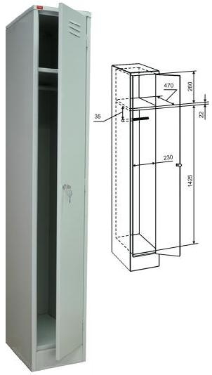 Шкаф металлический разборной двухсекционный, предназначен для хранения сменной одежды. В каждом отделении находятся полка для головных уборов и перекладина для вешалки. Отделение шкафа оснащено индивидуальным врезным замком. Покрытие - полимерное порошковое серого цвета (RAL 7035).